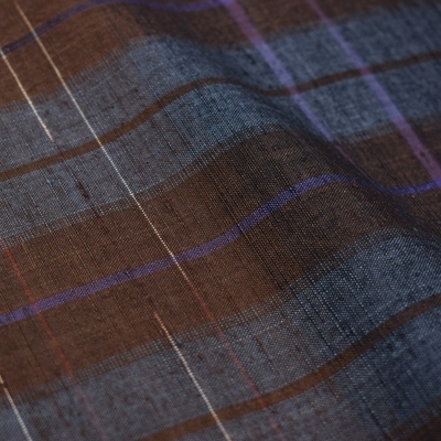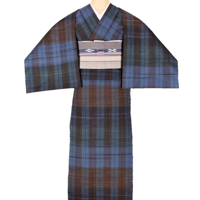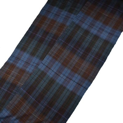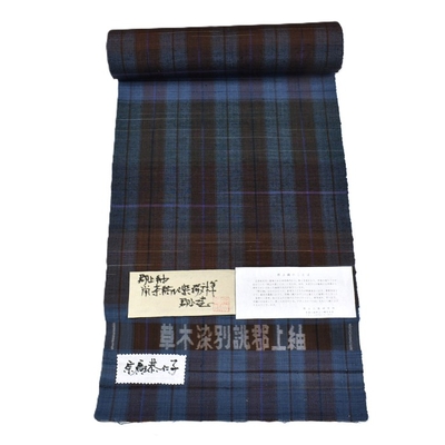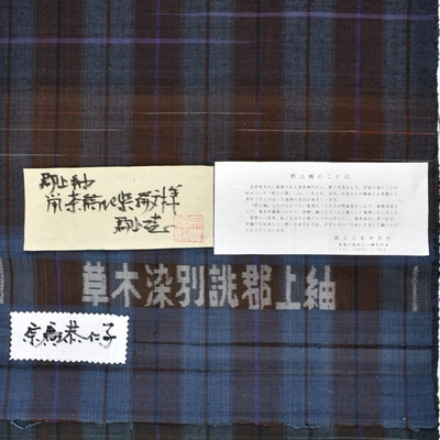 郡上紬 着尺 鼡茶縞地紫絣文様 青 茶 紫 緑